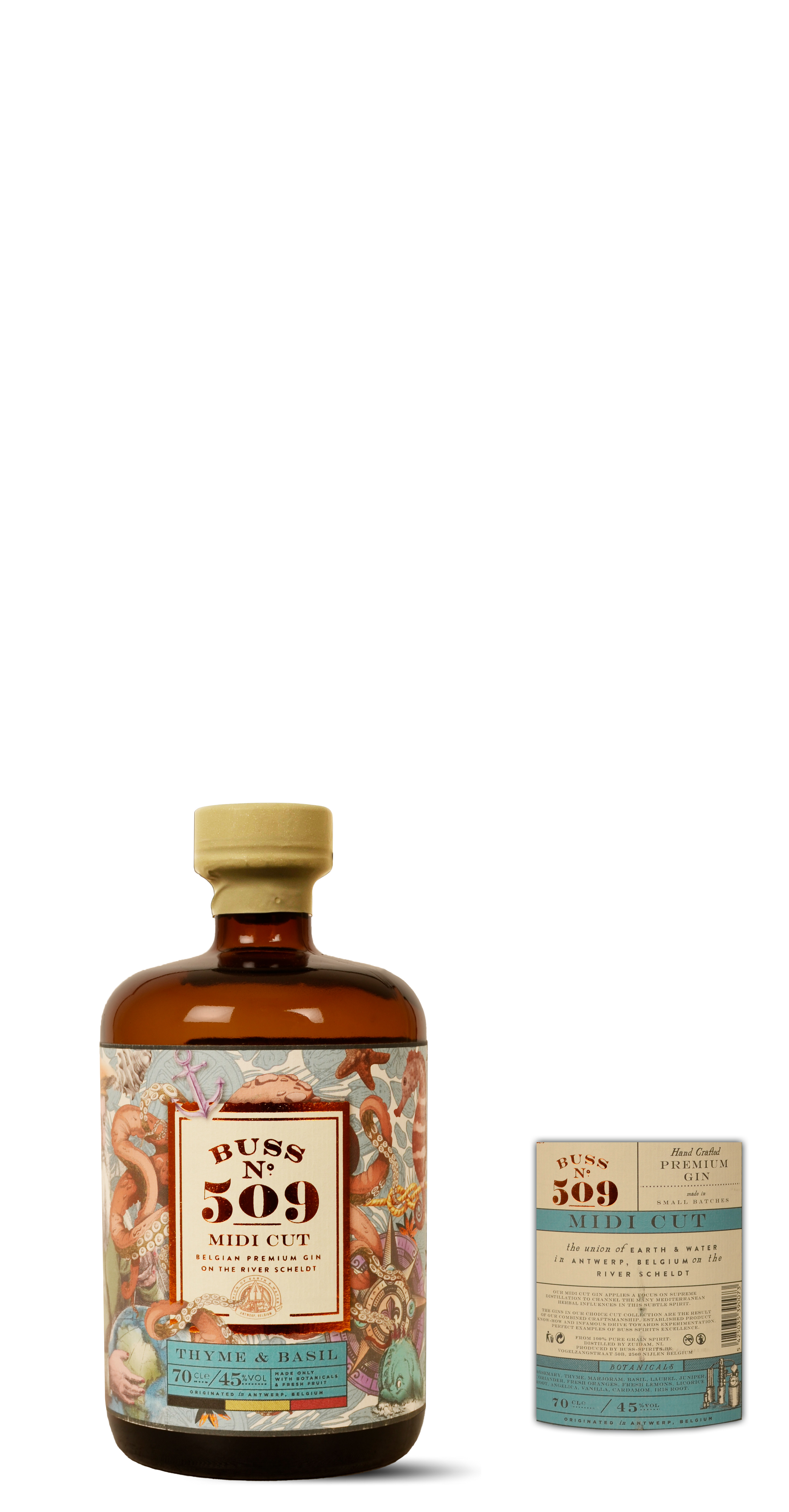 BUSS N° 509 White Rain is our third gin to launch, crafted with a rich blend of herbs and spices and of Belgian origin, inspired by passion and expertise. Created in Antwerp, we blended the finest herbs and spices with a premium spirit to create a gin with a beautiful, complex flavor. Buss N° 509 is a hand-distilled product. No machinery is used, and no additives (such as sugar, colorants, or artificial flavors) are added. 50% alcohol, clear, transparent color, 100% pure grain, 100% fresh plants, herbs, and fruits: juniper, coriander, licorice, angelica, vanilla, cardamom, iris, orange, lemon, verbena, marjoram.